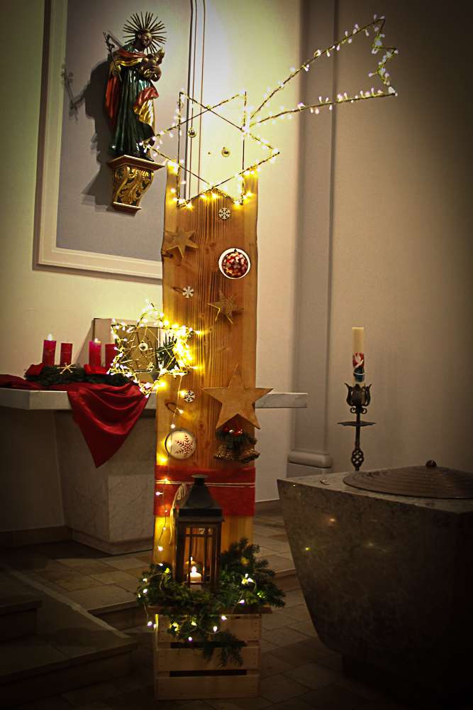 Im Anschluss wurde es laut in der Kirche; die Stimmen des Männerchors gesellten sich zu jenen des Kirchenchors. Den Auftakt machte dabei der gemeinsam gesungene „Adventjodel„. Der Chor, inzwischen auf über 50 Stimmen angewachsen, vemochte das Kirchenschiff mit seiner Klangfülle bis unters Dach zu fluten. Der Höhepunkt wurde erreicht als, dirigiert von Alberto, die Konzertbesucher bei dem Lied „Oh du Fröhliche“ die Sängerinnen und Sänger aus vollem Herzen unterstützten.