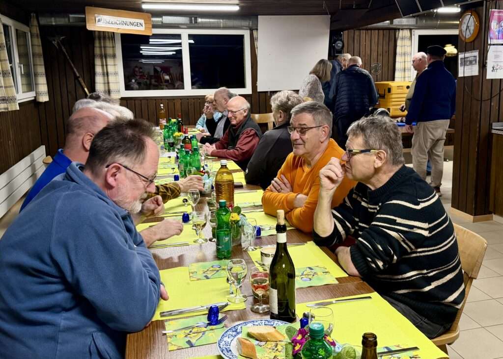 Ein gemütlicher Abend eines Gesangsvereins läuft selbstverständlich nicht ohne denselben ab. Die Eröffnung machte das Lied „So ein Tag, so wunderschön wie heute“, dirigiert von unserem Dirigenten Georg und der Unterstützung der anwesenden Begleiterinnen. Es folgten das Alpenrösli und das Schifferlied. Den Abschluss bildete, wie nicht anders zu erwarten, der „Bajazzo“ und das Lied als „Freunde kamen wir“.