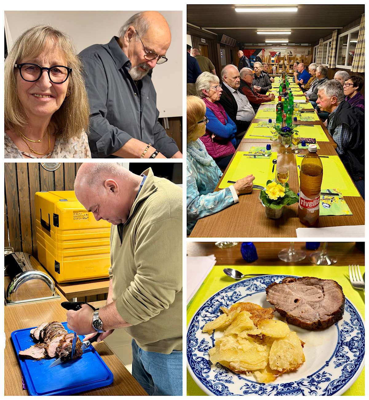 Der Abend wurde mit dem feinen Essen, Rollbraten vom offenen Feuer mit Kartoffelgratin, eröffnet. Ein spezielles Lob muss hier unserem Grillmeister ausgesprochen werden, welcher mit stundenlanger Geduld die Braten über dem offenen Feuer zur Perfektion grillte. Es ist jedoch zu erwähnen, dass er vorübergehende Unterstützung durch Max und Rolf erfuhr. Das Essen wurde abgeschlossen mit Fruchtsalat und Vanille Glace.